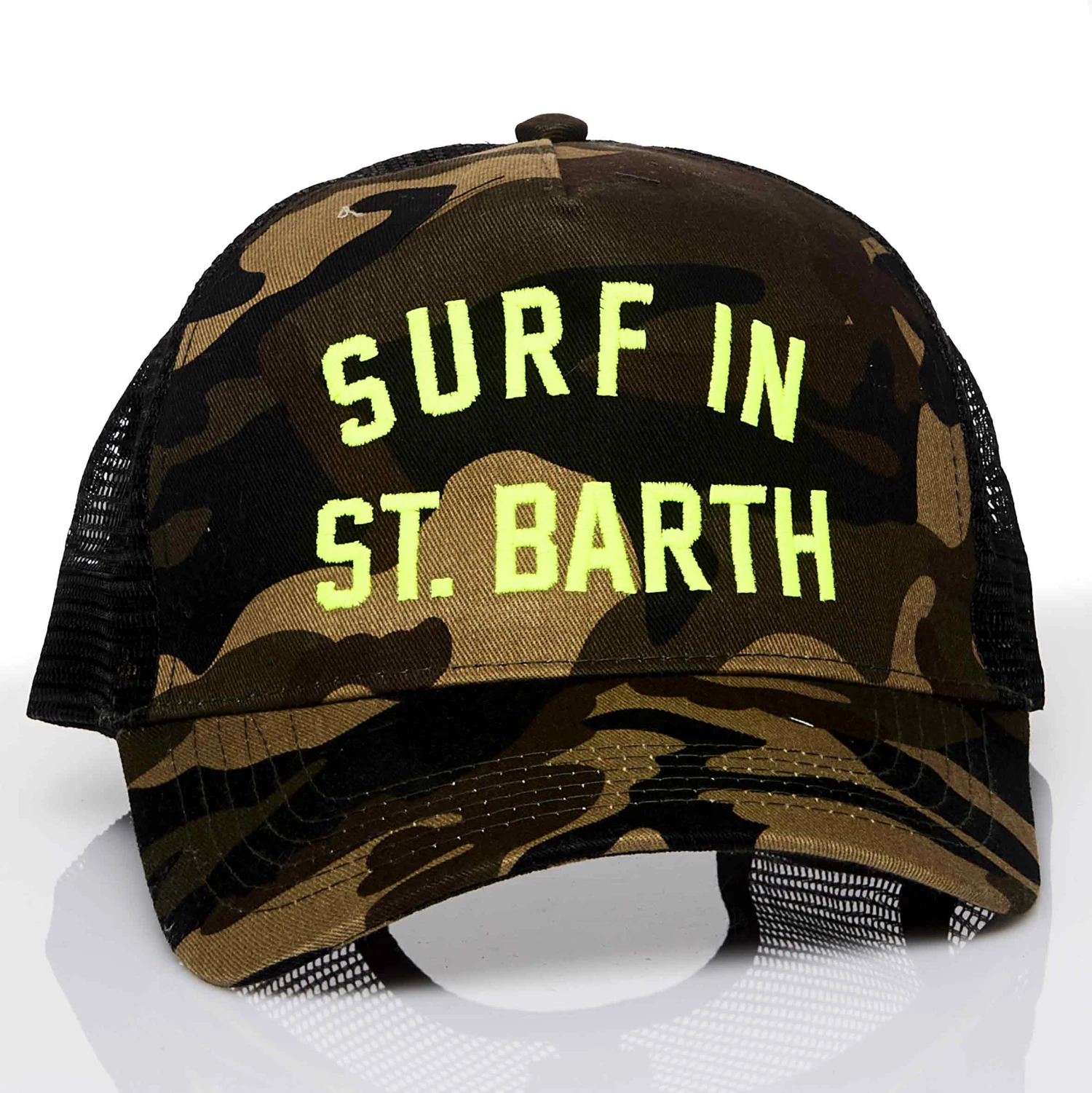Baseball cotton hat. High quality hat branded and embroidered Saint Barth logo yellow fluo. Camouflage cotton fabric. One size, adjustable. Mid-Profile, Fitted Hat, Comfort Fit Sizing. Composition: 100% cotton.