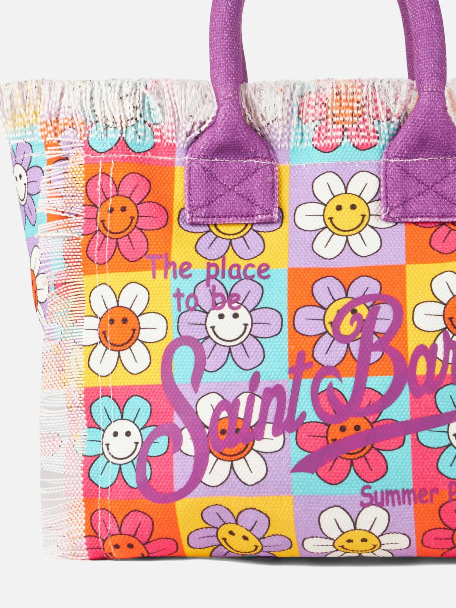 Multicolor canvas fringed handbag with smiling daisies all over print