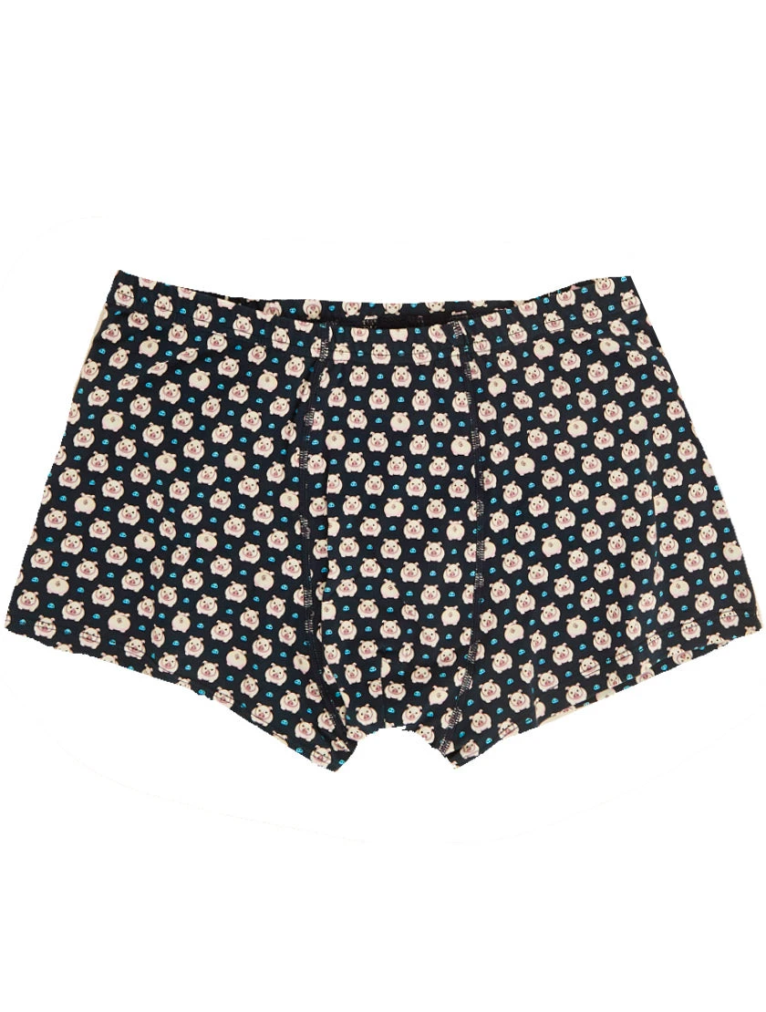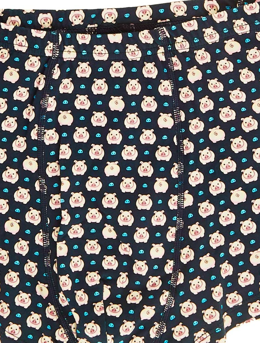 piggy print on blue backcloth, elastic waistband, slim fit.