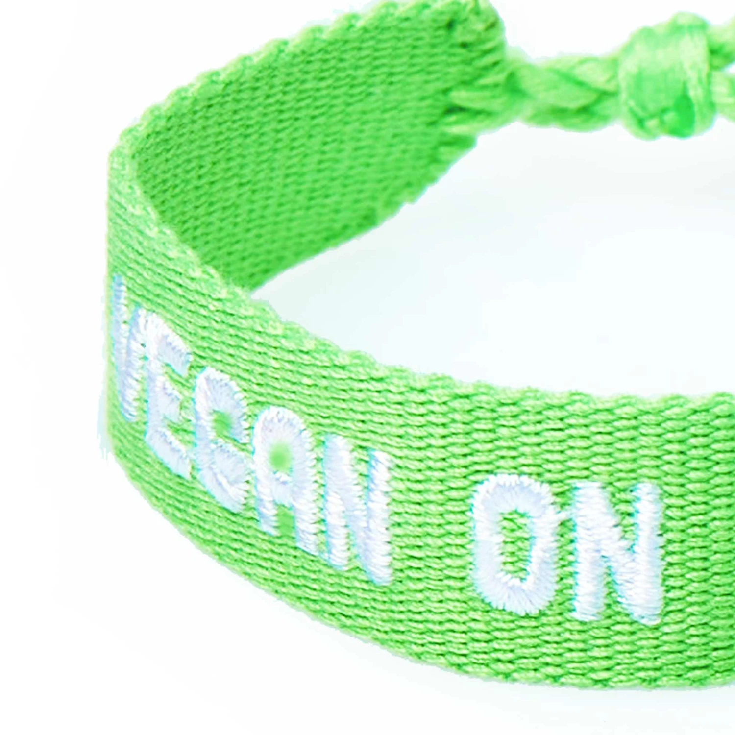 Fluo green cotton bracelet with tassels, white embroidery “Vegan on Holiday”, adjustable, unisex.
